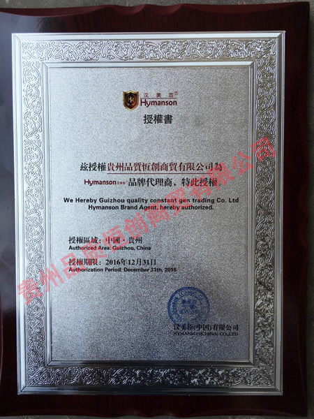 2016年8月2日貴州品質(zhì)恒創(chuàng)商貿(mào)有限公司獲得漢美臣中國有限公司貴州地區(qū)獨家授權(quán)書