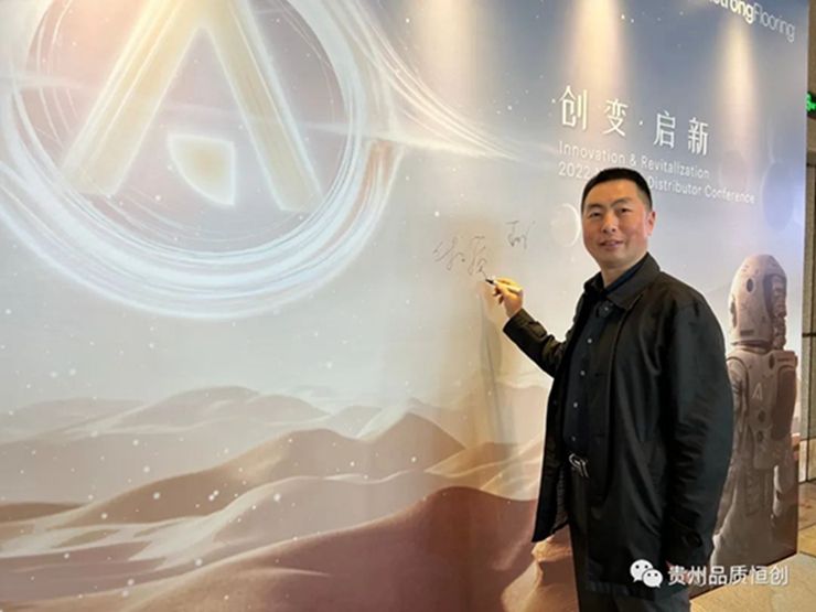 上午9:00,阿姆斯壯地材經銷商們陸續到達會場,并在簽到墻上簽下了各自的名字,以及對2022年的祝福語,在新的起點上,開啟新的征程。